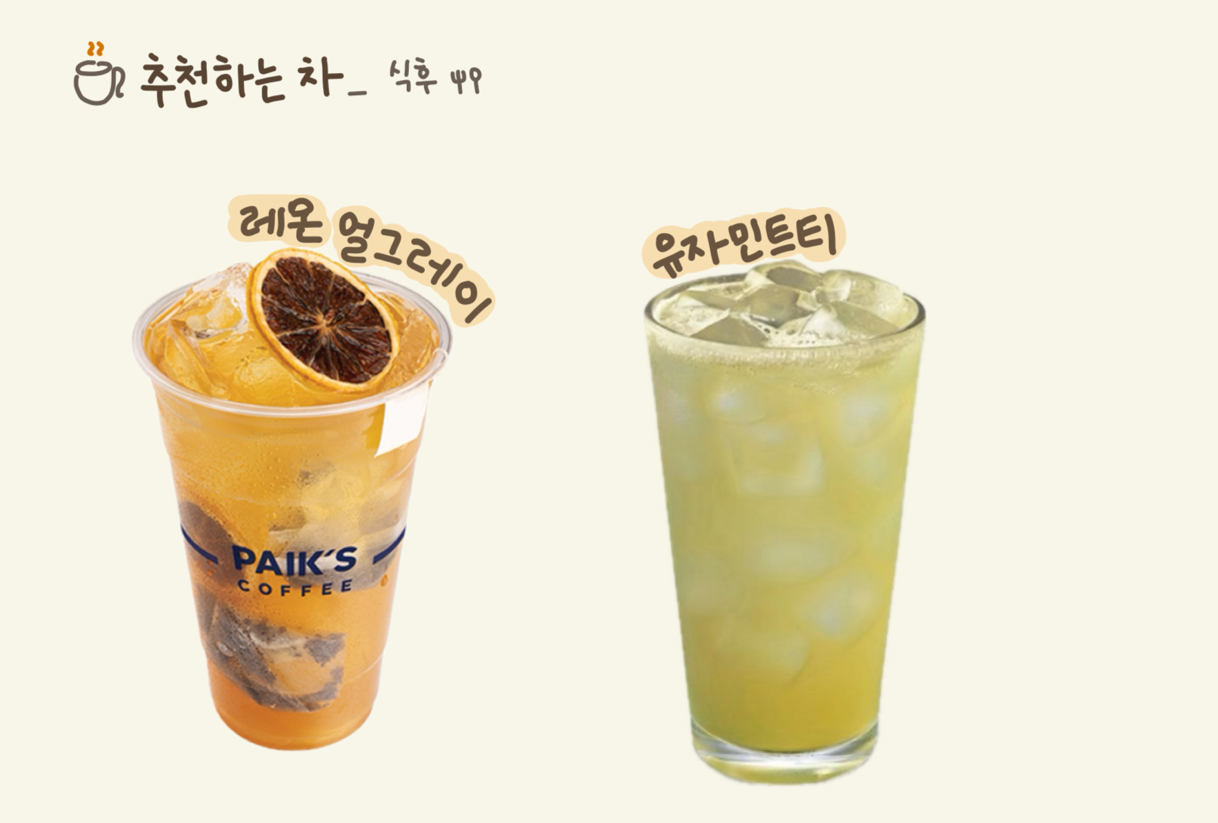 - 레몬얼그레이티는 적지만 카페인이 있어 식곤증을 완화할 수 있고, 유자민트티는 많이 달지 않아서 식후 상쾌하게 즐기실 수 있어요 :)