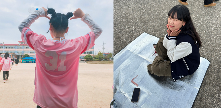 과잠 위에 셔츠를 레이어드한 스타일, 자연스럽게 묶은 머리, 꾸안꾸 캠퍼스 룩까지.