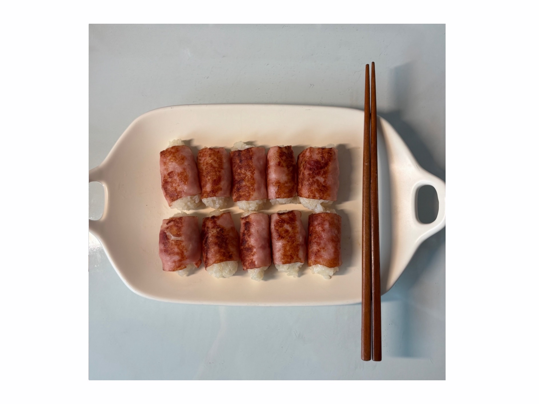 ⑵ 밥을 초밥처럼 뭉쳐 베이컨 위에 올려 돌돌 말아준다.