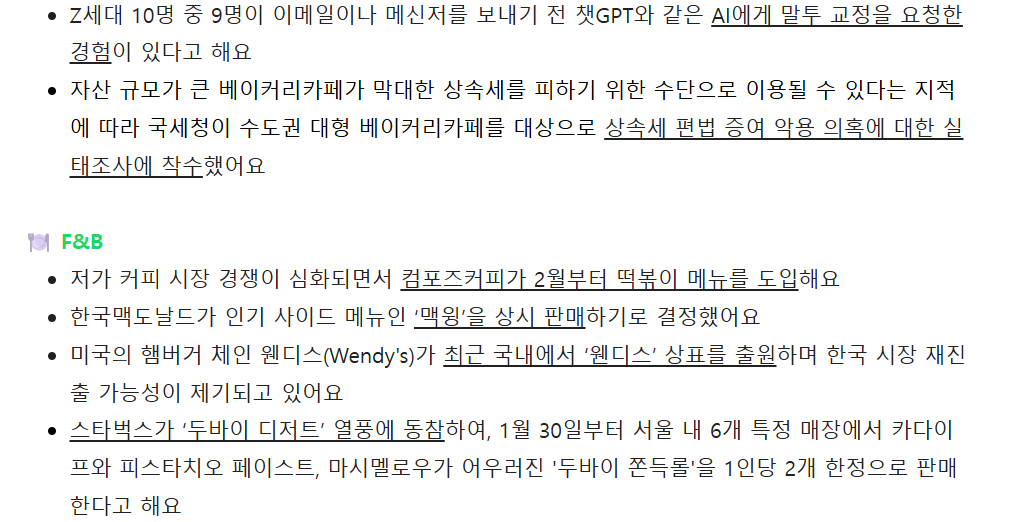 기사별로 핵심 내용을 한 줄로 정리하고, 주요 키워드에 밑줄을 적용했습니다.