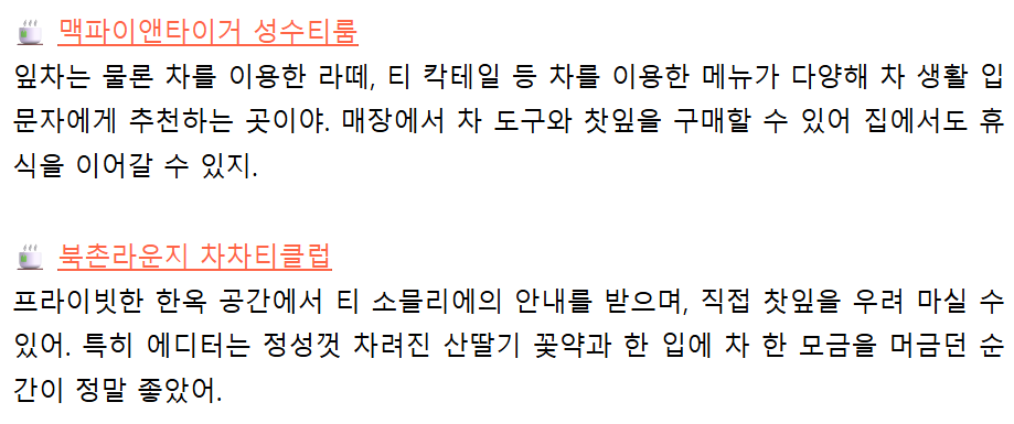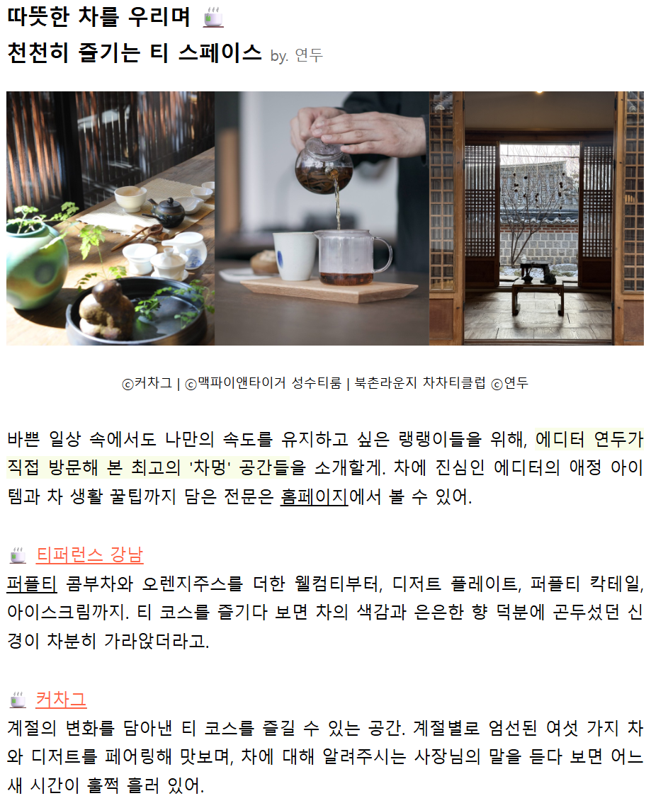 최근 23일 자를 발췌해서 소개해 볼까 합니다. 23일 자 주말토리에서는 에디터님이 직접 선별한 '차멍'공간들을 소개해 주셨습니다.