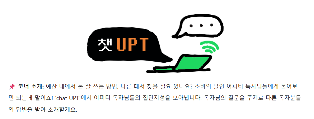 마지막 챕터는 독자들과 함께 만들어가는 챕터입니다. 독자님들의 사연을 신청받고, 이 뉴스레터를 읽는 분들이 직접 답변을 남겨줄 수 있는 코너입니다. 항상 Chat UPT가 운영되는 것은 아니고 독자분들께 추천받은 전국 맛집 리스트나 본인만의 레시피, 음식들을 소개하는 등 매주 바뀌는 컨셉과 소식이 독자들을 기다리고 있답니다.
