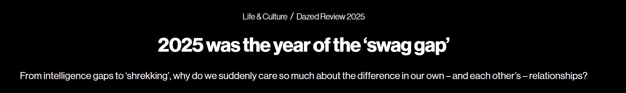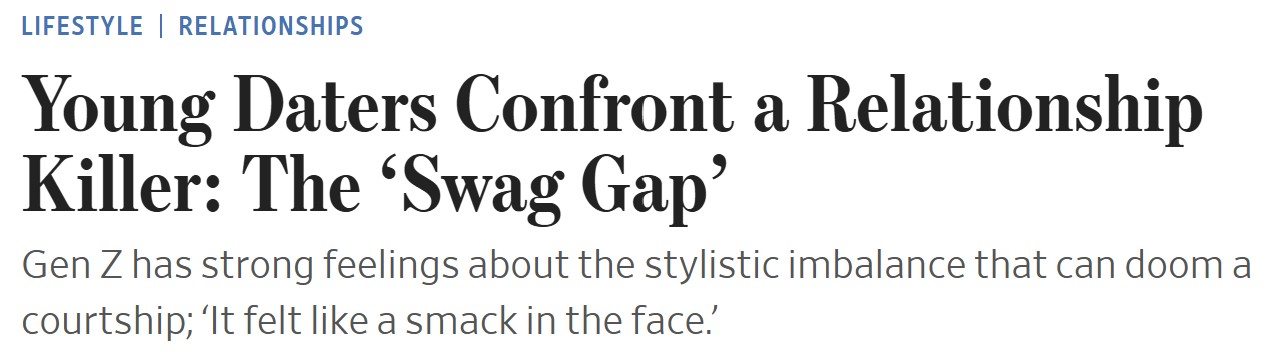 구글 트렌드데이터에 따르면, 지난해 ‘스웨그 갭(swag gap)’ 검색량은 9월에서 10월 사이 100% 급증했습니다. 패션 메거진 데이즈드는 틱톡에서도 스웨그 갭에 대한 콘텐츠가 넘쳐난다며, 이런 관계를 ‘무슨 수를 써서라도 피해야 할 것’이라고 표현했습니다.