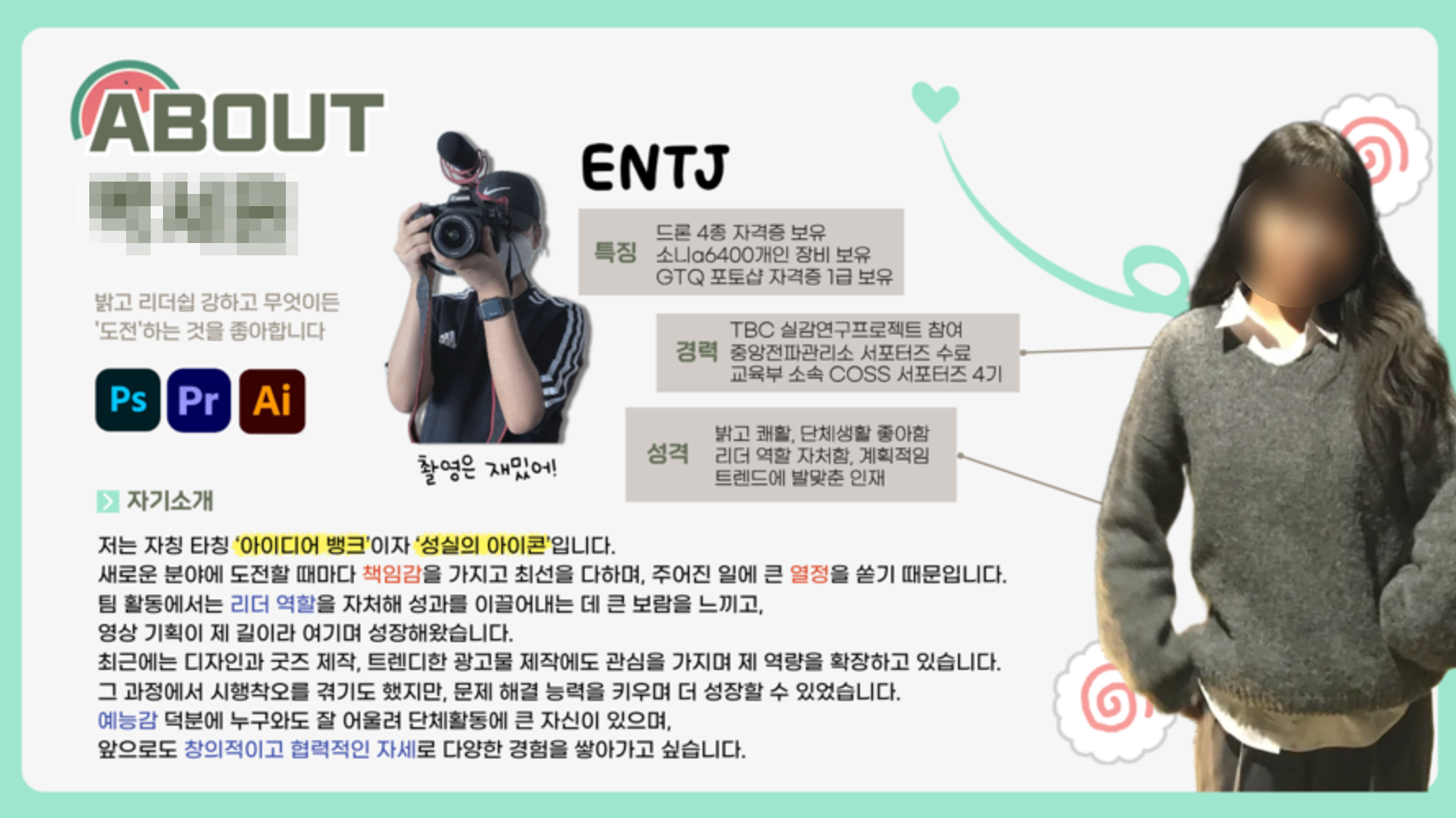 자기소개서는 PPT 1장에 자신을 나타내서 면접 때 마치 PT처럼 발표해야 했는데요, 직관적으로 눈에 띄도록 만드는 것이 중요해요.
