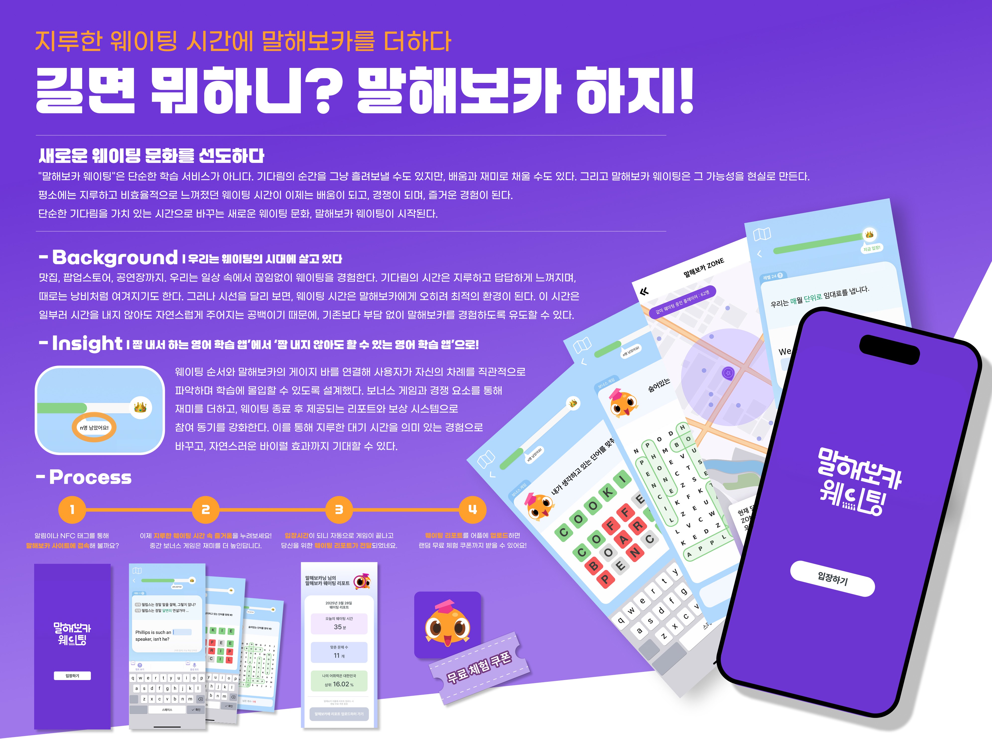 즉, 기다림이라는 일상적인 행동에 말해보카를 자연스럽게 연결하여, 사용자가 별도의 시간을 내지 않아도 영어 학습을 경험할 수 있도록 만드는 것을 목표로 했습니다.