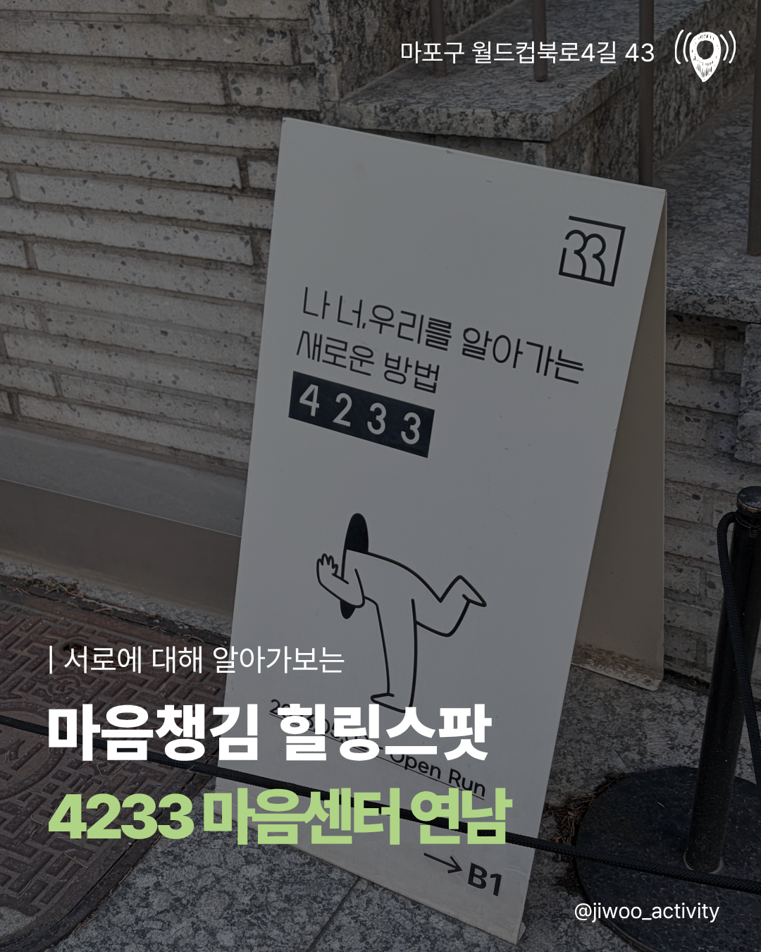 피드 (게시글) 은 조금더 전달하고 싶은 정보를 위주로 게시글을 발행하고 있어요. 마음챙김이 가능한 공간이라거나, 카페, 힐링 스팟 등을 정리해서 공유하려고 노력해요.
